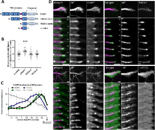 FIGURE 3:. MT polymerization-incompetent CKAP5 deletion mutants still localize to MT plus-ends in growth cones.(A) Diagram depicting mNG-labeled CKAP5 deletion proteins and associated domains, comprised of N-terminal TOG domains (1–5), a MT lattice–binding region (purple), and a plus-end localizing C-terminal domain (C-term). (B) MT growth speeds quantified using plusTipTracker software. Average MT growth speed of CKAP5 expressing growth cones displayed as normalization to control mean shows increased MT growth speed with CKAP5. (C) Fluorescence intensity profile of CKAP5 constructs localized along MTs measured using line-scan averages from MTs. (D) Representative images of growth cones expressing CKAP5 constructs. Time-lapse montages and magnified views of boxed MTs show CKAP5 construct localization along MTs. CKAP5 deletion constructs show distinct localization; MT plus-end (CKAP5 and TOG5-C-term), MT lattice and the plus-end (TOG3-Cterm), or low level of MT lattice–only localization (++TOG5). Magenta: MTs, green: CKAP5 constructs.Scale bar = 5 µm (growth cone images), 2 µm (time-lapse MT montages).