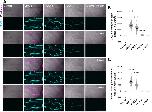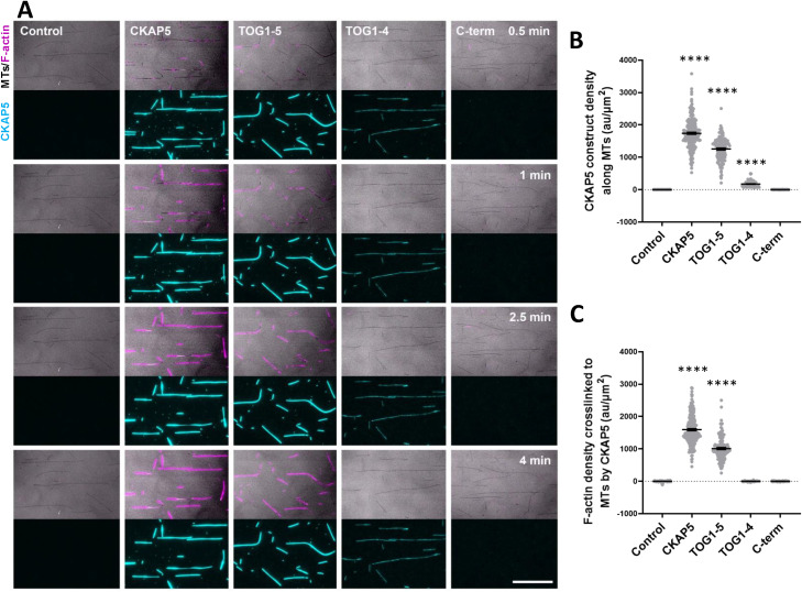FIGURE 2:. The TOG5 domain is necessary for MT-F-actin cross-linking in vitro.(A) Representative time lapse TIRF images of F-actin cross-linking to MTs in the absence (control) or in the presence of mNG-CKAP5 or TOG domain constructs. (B) Density (mean ± st. dev) of 10 nM CKAP5 or other constructs on the surface of MTs after 4 min incubation and MTs analyzed for each construct; control: −0.1 ± 2.0 au/µm2; n(MTs) = 206, CKAP5 full-length: 17 ± 4.6 × 102 au/µm2; n(MTs) = 218, TOG1-5: 13 ± 3.6 × 102 au/µm2; n(MTs) = 133, TOG1-4: 17 ± 8.5 × 101 au/µm2; n(MTs) = 127, C-term: −0.1 ± 3.7 au/µm2; n(MTs) = 128. (C) Density (mean ± st. dev) of F-actin cross-linked to MTs in the absence (control) or presence of CKAP5 constructs, control: −2.6 ± 15 au/µm2; n(MTs) = 206, CKAP5 full-length: 17 ± 4.5 × 102 au/µm2; n(MTs) = 218, TOG1-5: 10 ± 3.6 × 102 au/µm2; n(MTs) = 133, TOG1-4: 8.3 × 10−2 ± 7.4 au/µm2; n(MTs) = 127, C-term: −4.7 × 10−1 ± 6.5 au/µm2; n(MTs) = 128. Magenta: F-actin, cyan: CKAP5-mNG constructs, gray: MTs. Scale bar: 20 µm.