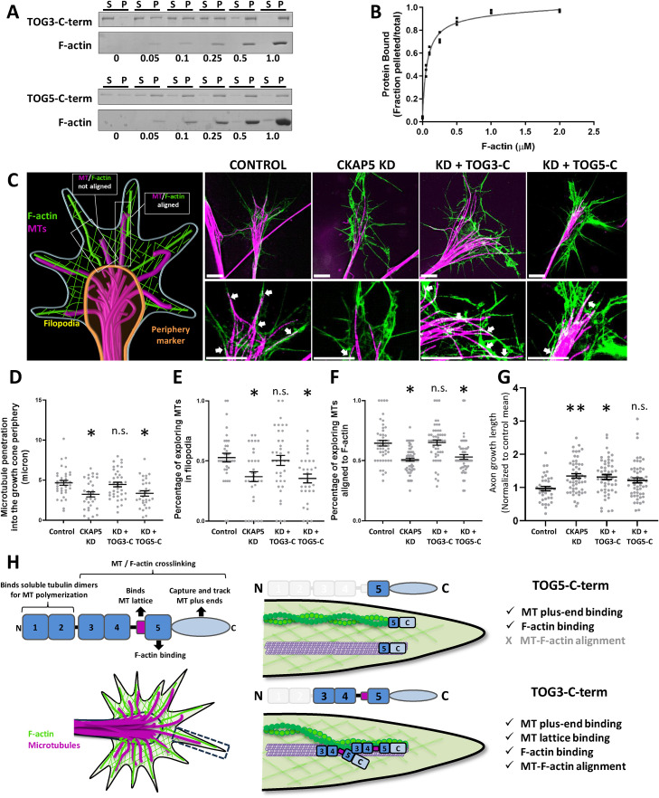 FIGURE 4:. MT polymerization-incompetent CKAP5 deletion mutants still promote MT-F-actin alignment of CKAP5 in growth cones.(A) SDS–PAGE images showing levels of CKAP5 TOG3-C-term and TOG5-C-term domain constructs in supernatant (S) and pellet (P) following sedimentation with F-actin. CKAP5 proteins incubated with increasing amounts of F-actin protein. (B) F-actin binding curve of CKAP5 TOG3-C-term domain interacting with F-actin in sedimentation assays. (C) Cartoon depicting growth cone structure with MTs (magenta) in the central domain and F-actin (green) in the periphery. Representative SIM images of growth cones from control, CKAP5 KD and rescues by TOG3-C and TOG5-C. A magnified view of growth cone peripheral region showing MTs (magenta) aligned to F-actin (green) denoted by white arrows. (D) Average lengths of MTs extending into the periphery following CKAP5 KD, or rescues with indicated deletion construct. (E) Percentage of exploring MT populations that extend into filopodia measured following CKAP5 KD, or CKAP5 KD and rescue with indicated deletion construct. (F) Percentage of exploring MTs aligned to F-actin. (G) Axon growth length of neural tube explants overexpressing CKAP5, TOG3-C-term and TOG5-C-term compared with control. (H) Cartoon depiction of the CKAP5 protein with its TOG domains and their role in regulating interactions with MTs and actin filaments. n.s. = no significance. *** P<0.001, **** P<0.0001. Scale bar = 5 µm.