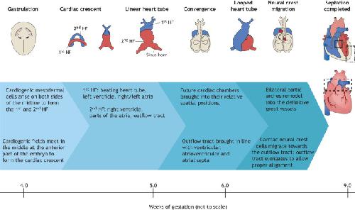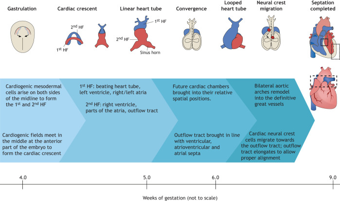 Fig. 1. Cardiac development in the human embryo. This schematic shows the embryonic development of the human heart through first and second heart field (HF) formation, heart tube formation and pumping, looping, neural crest migration and septation, resulting in a fully developed heart at the end of gestation. Boxed areas highlight structures typically affected by congenital malformations (solid lines: atrial and ventricular septal defects; dotted lines: hypoplastic ventricles; dashed lines: aortic and pulmonary valve defects and defects of the great vessels, such as transposition).