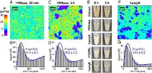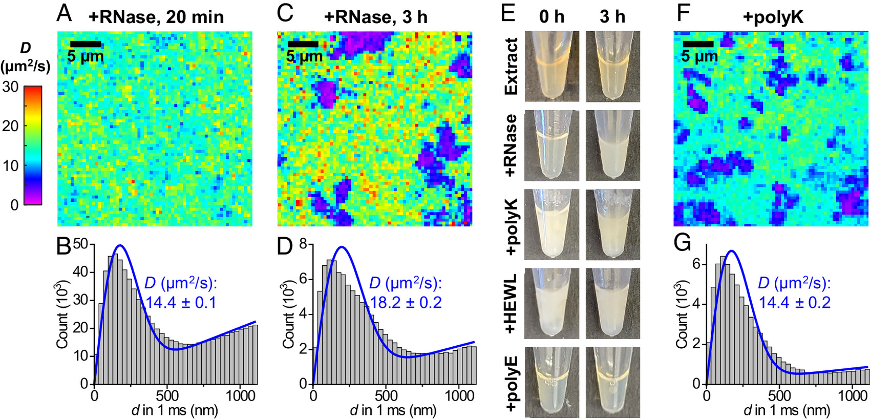 Fig. 3. SMdM diffusivity mapping of HEWL in RNase-treated egg extracts further underscores the charge-sign asymmetry of the cytoplasmic environment. (A) Color-coded SMdM diffusivity map of Cy3B-labeled HEWL in an extract sample 20 min after RNase A treatment at room temperature. (B) Distributions of single-molecule displacements for the data in (A). Blue line: fit to the SMdM diffusion model, with resultant apparent diffusion coefficient D and 95% CI noted. (C) SMdM diffusivity map of the same sample after 3 h. (D) Distributions of single-molecule displacements for regions outside the low-diffusivity domains in (C). (E) Photos of extract samples taken immediately (Left) and after 3 h (Right), after RNase A treatment or the addition of 1 mg/mL polylysine, HEWL, or polyglutamic acid. (F) Color-coded SMdM D map of Cy3B-labeled HEWL in an extract sample supplemented with 1 mg/mL polylysine. (G) Distribution of single-molecule displacements for regions outside the low-diffusivity domains in (F).