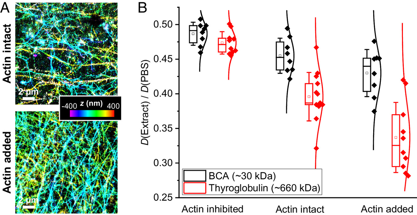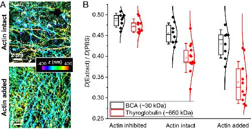 Fig. 4. Importance of the actin cytoskeletal network in molecular size-dependent diffusion suppression. (A) 3D-STORM superresolution images of phalloidin-labeled actin filaments in actin-preserved (Top) and actin-supplemented (Bottom) Xenopus egg extracts. Color presents axial (depth) information. (B) SMdM-determined D values in the extract relative to in PBS, for the ~30 kDa BCA (black) and the ~660 kDa thyroglobulin (red), in actin-inhibited, actin-intact, and actin-supplemented samples. Each data point corresponds to one independent SMdM measurement for a different sample region, from ~3 samples under each condition.