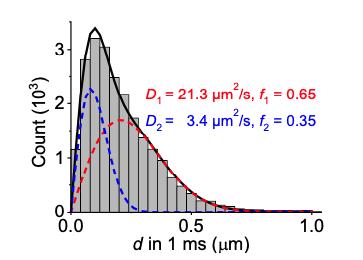 Figure S2. Two-component D fit to the distribution of SMdM-recorded 1-ms single-molecule displacements of Cy3B-labeled HEWL diffusing in extract as shown in Fig. 1d. Histogram: displacements; Red curve: fast component of the fit (D1 = 21.3 μm2/s, fraction f1 = 0.65); Blue curve: slow component of the fit (D2 = 3.4 μm2/s, fraction f2 = 0.35); Black curve: sum of the red and blue curves. While the two-component fit improves over the single-component model (Fig. 1d), the system may be better assumed as a continuous distribution of different transient states.