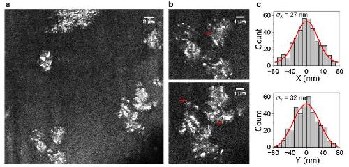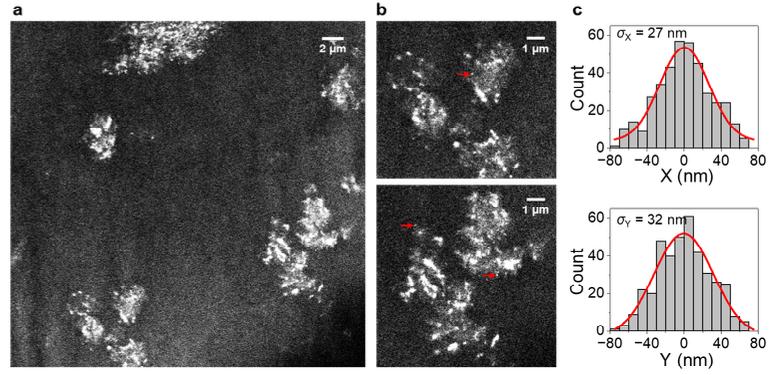 Figure S4. SMLM super-resolution images of Cy3B-labeled HEWL in RNase-treated extract, as generated from the single-molecule localizations of the SMdM data. (a) Same field of view as the SMdM data of Fig. 3c. (b) Zoom- ins of two regions. (c) Distribution of single-molecule positions for overlaid 4 small nanoclusters like those indicated by the red arrows in (b), in the X (top) and Y (bottom) directions, respectively. Gaussian fits (red curves) give standard deviations of 27 and 32 nm.