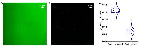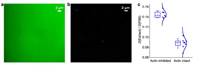 Figure S7. Additional data related to actin filaments. (a,b) Typical epifluorescence (a) and STORM (b) images of phalloidin-AF647 in actin-inhibited Xenopus egg extracts, showing no resolvable structures. (c) SMdM-determined D values in the extract relative to in PBS, for the positively charged HEWL in actin-inhibited and actin-intact extracts. Each data point corresponds to one independent SMdM measurement for a different sample region, from 5 actin-inhibited and 3 actin-intact samples, respectively.