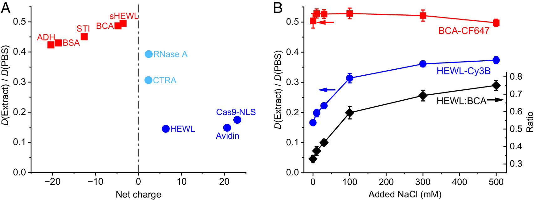 Fig. 2. Net-charge effects on protein diffusion in Xenopus egg extract. (A) SMdM-determined diffusion coefficients D in the extract relative to those in PBS for different proteins, as a function of their net charges in the range of −25 to +25. (B) Blue and red symbols: Relative in-extract D values normalized to in-PBS values, plotted as a function of added NaCl, for the positively charged HEWL-Cy3B (blue) and the negatively charged BCA-CF647 (red). Values were obtained through sequential SMdM in two color channels. Error bars: Sample SD between results from two or three SMdM measurements at each data point. Black diamonds (y-axis on the Right): Ratio between the PBS-normalized D values of the two proteins.