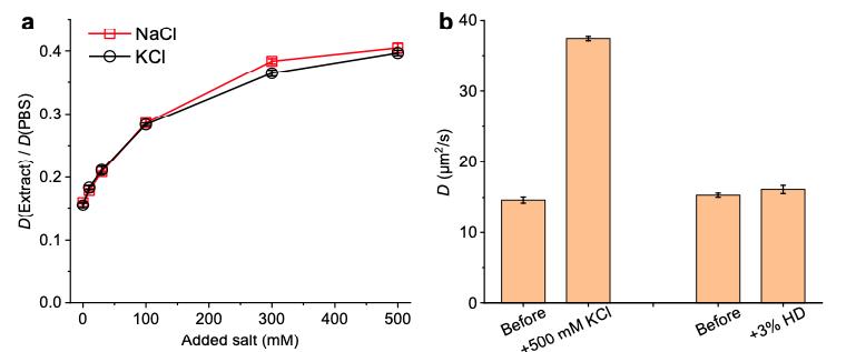Figure S3. Diffusion of Cy3B-labeled HEWL in extracts supplemented with NaCl, KCl, and 1,6-hexanediol. (a) SMdM-determined relative in-extract D values of Cy3B-labeled HEWL normalized to in-PBS values, for two samples separately added with NaCl (red) and KCl (black) to different concentrations. Error bars: Sample standard deviations between results from three SMdM measurements at each data point. (b) SMdM-determined D values of Cy3B-labeled HEWL in two extract samples, before and after separately adding 500 mM KCl or 3% 1,6-hexanediol. Error bars: Sample standard deviations between results from three SMdM measurements.