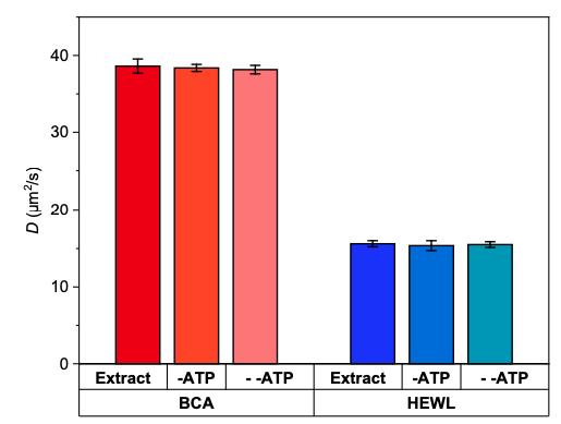 Figure S8. SMdM-determined D values of CF647-labeled BCA and Cy3B-labeled HEWL in extracts with different ATP levels. “Extract”: Typical samples added with 1x energy mix (4 mM creatine phosphate, 0.5 mM ATP, 0.05 mM EGTA, and 0.5 mM MgCl2). “-ATP”: Samples obtained in the same preparation but without addition of the energy mix. “- -ATP”: “-ATP” samples further subjected to ATP depletion by apyrase [New England Biolabs M0398S; incubated at 1:40 (12.5 units/mL) for 20 min], a condition known to abolish energy-dependent processes in extract, e.g., cell-like compartmentalization (8) and DNA compaction (9). Error bars: Sample standard deviations between results from three SMdM measurements.