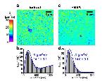 Figure S1. SMdM diffusivity mapping of Cy3B-labeled HEWL in untreated and BSA-supplemented Xenopus egg extracts. (a) Color-coded SMdM diffusivity map for an untreated sample, presented on the same color scale as Fig. 3. (b) Distribution of the 1-ms single-molecule displacements from (a). Blue curve: fit to our single-mode SMdM diffusion model, with resultant apparent diffusion coefficients D and 95% confidence intervals marked. Note that in this sample, a higher concentration of Cy3B-labeled HEWL (~1 nM) was used to increase the detected single- molecule density to facilitate spatial mapping. While this led to a higher background in the displacement distribution (when compared to Fig. 1d), the D value obtained with our fitting model (Eqn. 1) stays consistent, in agreement with what we have analyzed and demonstrated previously (6). (c) Color-coded SMdM diffusivity map for another sample to which BSA was added at 1 mg/mL. (d) Distribution of the 1-ms single-molecule displacements from (c) and fit to our model.