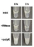 Figure S6. Aggregation assays for the ribosome-depleted high-speed extracts (HSEs). Photos are shown for HSEs at 0 h (left) and 3 h (right), without or with the addition of RNase or 1 mg/mL polylysine. Whereas polylysine addition generated immediate clouding, RNase treatment did not induce clouding over 3 h, consistent with our model that in the crude, ribosome-containing cytoplasm extract, RNase degradation of rRNA releases positively charged ribosomal proteins to cause aggregation.