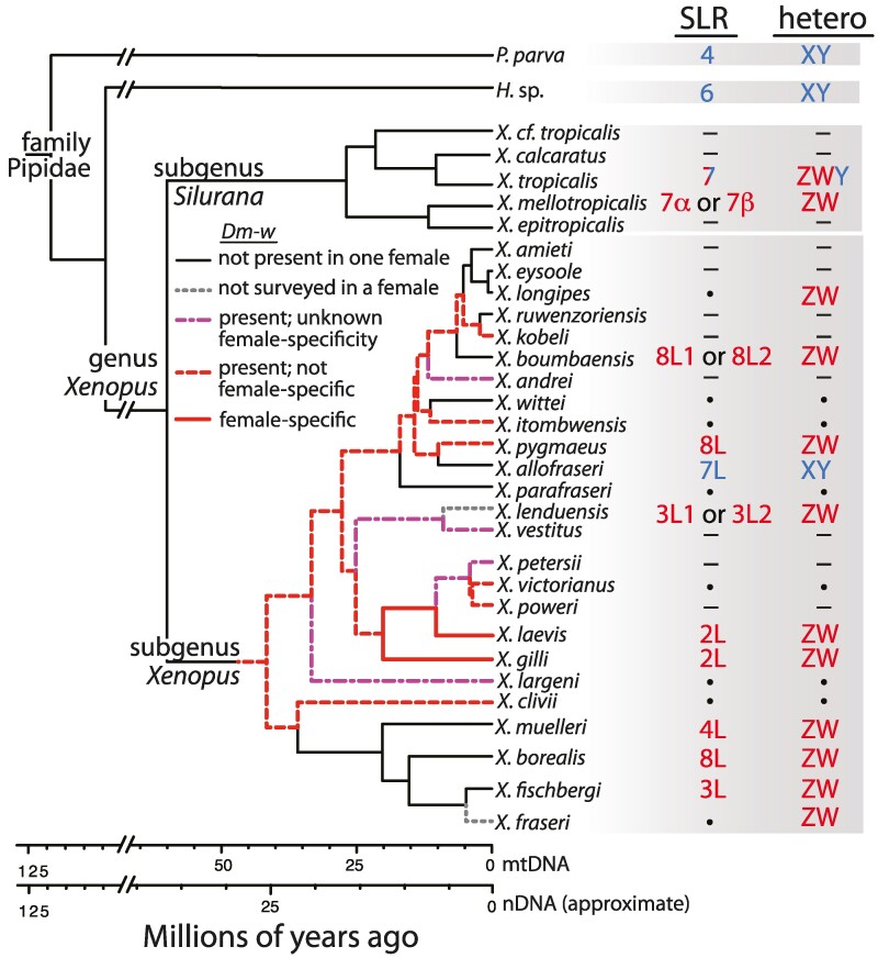 Fig. 1. Phylogenetic affinities of at least eight nonhomologous sex-linked regions exist in Xenopus. The sex-linked regions (SLR) are on chromosomes that are indicated with numbers, and letters after these numbers refer to subgenomes (L or S for allotetraploids in subgenus Xenopus, L1, L2, S1, or S2 for allooctoploids in subgenus Xenopus, α or β for allotetraploids in subgenus Silurana; Evans et al. 2005, 2015). The heterogametic sex (hetero) is indicated with ZW for female heterogamety and XY for male heterogamety, or ZWY for X. tropicalis (see main text). The time-calibrated phylogeny was estimated from complete mitochondrial genomes (Evans et al. 2019) that do not reflect reticulating relationships among allopolyploid species. Scale bars illustrate variation in date estimates when analyses are performed using mitochondrial (Evans et al. 2019) and nuclear DNA (Evans et al. 2015). Black dots indicate unknown information from some species that were surveyed using RRGS data in this study; dashes indicate species for which RRGS data are not currently available. Results from X. laevis, X. borealis, X. tropicalis, X. mellotropicalis, P. parva, and Hymenochirus sp. (H. sp. as Hymenochirus boettgeri) were previously reported (Yoshimoto et al. 2008; Olmstead et al. 2010; Roco et al. 2015; Furman and Evans 2016; Cauret et al. 2020, 2023).