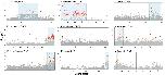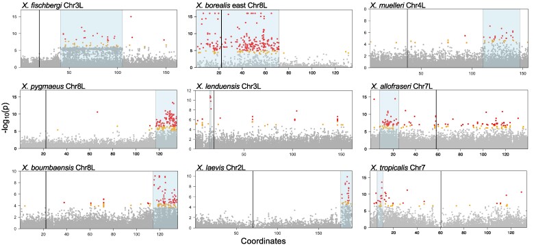 Fig. 2. Eight nonhomologous sex-associated regions in nine Xenopus species based on analyses of genetic association and sex specificity (RADsex; see main text), including five newly described here. Gray, orange, and red dots indicate the −log10 transformed probability (P) for a test of whether each SNP is associated with sex, and correspond to >0.1%, 0.1–0.05%, or the <0.05% percentiles, respectively, across genome-wide RRGS variants for each species. Sex-associated regions supported by association tests and RADsex analysis are highlighted in blue; centromere locations of the reference genomes are indicated with vertical lines. These plots show only the sex chromosomes for each species; plots of the whole genome for each species are provided in supplementary fig. S1, Supplementary Material online. Except for X. lenduensis, data from all species depicted here are at least partially from lab-bred families.