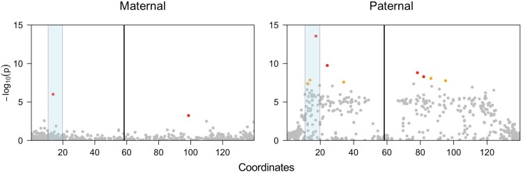 Fig. 3. Male heterogamety in X. allofraseri is evidenced by multiple strongly sex-associated paternal SNPs (right) but far fewer sex-associated maternal SNPs (left) on the sex chromosome (Chr7L). Labeling follows Fig. 2. Gray, orange, and red dots indicate that the −log10 transformed probability (P) that SNPs are associated with sex, and correspond to >0.1%, 0.1–0.05%, or the <0.05% percentiles, respectively, across maternal (left) or paternal (right) genome-wide RRGS variants. These data are from X. allofraseri family 1; data from the other two families are plotted in supplementary fig. S8, Supplementary Material online.