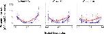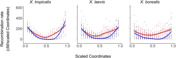 Fig. 4. Heterochiasmy is evidenced in three Xenopus species: X. tropicalis (left), X. laevis (center), and X. borealis (right) by maternal (red) and paternal (blue) recombination landscapes. Lines indicate smoothed estimates of recombination rates during oogenesis (red) and spermatogenesis (blue) across linkage groups from all intraspecific chromosomes, with standard errors of these estimates in gray. Chromosomes were scaled to be one unit long (x-axis); recombination rates (y-axis) were estimated from the first derivative of predicted values of a spline with a monotonic increase that was fitted to the largest maternal and paternal linkage group from each chromosome after scaling (red and blue dots, respectively). Plots of genetic versus physical map distances and corresponding estimates of recombination rate for individual chromosomes in each species are provided in supplementary figs. S11 and S12, Supplementary Material online.