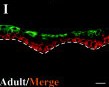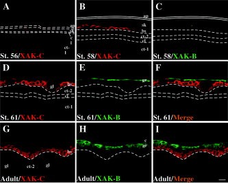 Figure 4. Immunohistochemistry of XAK-C and XAK-B. Sections of skin tissues were prepared from tadpoles at stage 56 (St. 56, A), 58 (B,C), and 61 (D), and adults (G) and subjected to immunohistochemistry for XAK-C (A,B,D,G) and XAK-B (C,E,H). Red and green color represent stains of XAK-C and XAK-B, respectively. F and I are the merged images of D and E, and G and H, respectively. There was no XAK-C signal at stage 56. Basal cells at stage 58 were XAK-C positive, but no cells were positive for XAK-B. Basal cells of the skin at stage 61 and of adults were stained with antiAK-C antisera. XAK-B signals were detected in differentiated cells seen on both sections. Immunohistochemistry experiments were performed four times, and similar staining patterns were obtained reproducibly. Scale bar = 20 μm in I (applies to A).