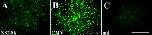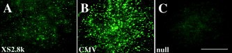 Figure 6. Transfection of the adult skin with XS2.8k/pEGFP. Skin pieces were isolated from adult Xenopus and were transfected with XS2.8k/pEGFP (A), CMV/pEGFP (B), and pEGFP-1 (null, C) by using a gene gun. The tissues were cultured for 48 hr and observed through a fluorescence-dissecting microscope. Identical gene gun experiments were carried out three times, and similar results were obtained reproducibly. Scale bar = 1 mm.