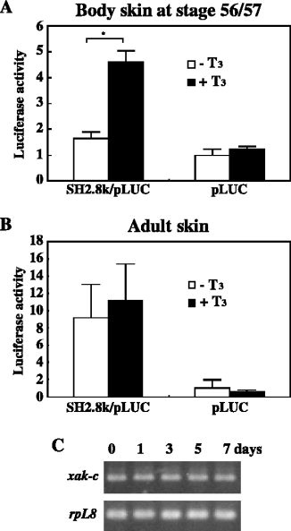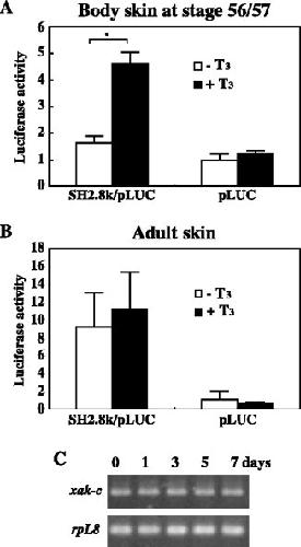 Figure 8. Effects of 3,5,3â²-triiodothyronine (T3) on promoter activity of the 5â²-flanking region of xak-c. Pieces of body skin were dissected from tadpoles at stage 56/57 tadpoles (A) and adults (B), transfected with SH2.8k/pLUC, and were cultured for 72 hr with or without 10 nM T3. As a control experiment, null-vector (pLUC) was similarly transfected to the tissues. The luciferase activity was determined for these skin tissues, and are shown as the average with SEM of at least three independent experiments. *P < 0.001, statistically significant level at 99.9% between with and without T3. C:Xenopus laevis adults were treated with 5 nM T3 for up to 7 days. RNAs were isolated from the skin at the indicated days and used as templates for reverse transcriptase-polymerase chain reaction of xak-c and rpL8.