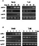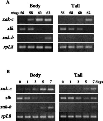 Figure 2. Expression of xak-c mRNA during spontaneous and 3,5,3â²-triiodothyronine (T3) -induced metamorphosis. A: RNAs were isolated from the body and the tail of tadpoles at the indicated metamorphic stages and used as templates for reverse transcriptase-polymerase chain reaction (RT-PCR) of xak-c together with xlk, xak-b, and rpL8. The rpL8 gene was used as an internal control (Shi and Liang, 1994). Identical RT-PCR experiments were repeated four times, and similar results were reproducibly obtained. B: Tadpoles at stage 54 were treated with 5 nM T3. RNAs were isolated from the body and the tail of tadpoles at the indicated days and used as templates for RT-PCR as in A. Identical RT-PCR experiments were repeated four times, and similar results were obtained reproducibly.