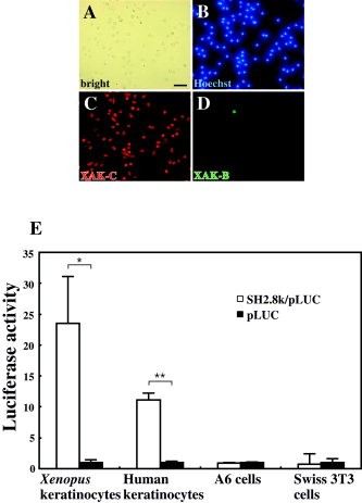 Figure 7. Keratinocyte-specific induction of the promoter activity of the 5â²-flanking region of xak-c. Xenopus adult keratinocytes were isolated, cultured for 72 hr, and fixed. The cells were stained with Hoechst 33342 and then with antisera against XAK-C and XAK-B. The immunosignals were visualized by anti-rabbit immunoglobulin (Ig) G Alexa 594 (red) and anti-rat IgG Alexa 488 (green) for antibodies against XAK-C and XAK-B, respectively. A: Bright-field, B: fluorescent field for Hoechst, XAK-C, and XAK-B, respectively. E: SH2.8k/pLUC was introduced into each of Xenopus keratinocytes, human keratinocytes, Xenopus A6 kidney cell line, and Swiss 3T3 cells. The transfected cells were cultured for 48 hr, and their luciferase activity was measured. The results are shown as the average with SEM of at least three independent experiments. *P < 0.01 and **P < 0.001 indicates the statistical level at a 99 and 99.9% significance between pLUC and SH2.8k/pLUC, respectively. Scale bar = 50 μm in A (applies to A).