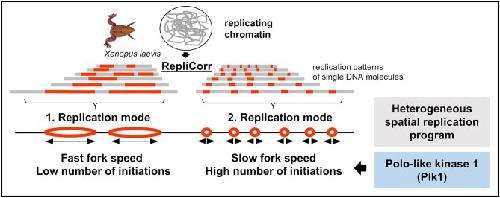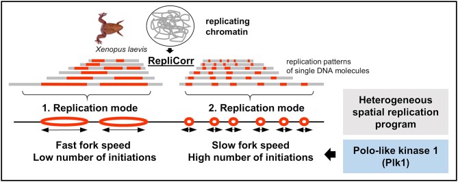 Figure 6. Plk1 depletion strongly increases fork speed and decreases initiation frequency in the slow process. (A) Comparison of initiation frequency and fork speed for the fast and slow replication process after Plk1 or Rif1 depletion and Chk1 inhibition or overexpression. Mean fold change of experiment/control for initiation frequencies per replicated fractions and fork speeds per experiment/control are shown for each replication mode, values from Supplementary Figure S10 and Supplementary Table S3, respectively. (B) Model of a Plk1-dependent regulation of the spatial replication program by a fast and slow replication process in Xenopus: in the presence of Plk1, two different replication patterns on DNA molecules can be distinguished, characterized by different fork speeds and initiation rates, leading to a non-uniform pattern of origin activation. Upon Plk1 depletion, origin activation along the genome becomes more homogeneous; the slow replication mode approaches the fast mode.
