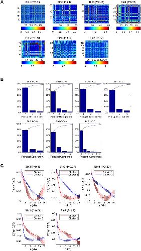 Figure 2. Hierarchical classification of DNA molecule’s replication patterns. (A) Similarity matrix between molecule’s C(r) for different replication fractions f. Each cell in the matrix represents the similarity s = 1 − pair-wise correlation coefficient between the C(r) of two molecules in the replication bin. A score s = 0 represents two perfectly similar C(r), and a score s = 1 represents two completely different C(r). (B) Pareto chart of the percent variability explained by each principal component. Each chart corresponds to a different interval of replicated fractions from 0 to 0.75; the average replicated fraction is reported on top. In each chart, the bars represent the percentage of variance described by the relative principal component in descending order. The line above represents the cumulative total. (C) Mean C(r, f) profiles for molecules hierarchically classified into two clusters, as suggested by the average silhouette value (Supplementary Figure S1). The C(r, f) of the category containing the smaller number of molecules is in cluster 1, and the C(r, f) of the category containing the larger number of molecules is in cluster 2. The fraction of molecules in each cluster is reported in Supplementary Figure S2. Error bars are standard deviations.