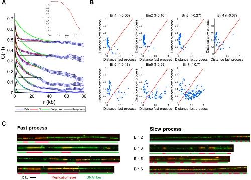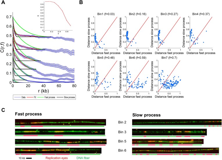 Figure 3. Categorization of DNA molecule’s replication patterns into two dynamical processes by RepliCorr. (A) Fit (red curve) of mean C(r, f) profile (blue curve, with standard deviation from three independent experiments) for each replication fraction bin calculated as C(r, f) = Θ(f)C1(r, f) + [1 − Θ(f)]*C2(r, f). The green curve is the correlation profile produced by the fast fork process [C1(r, f), model 1], and the black curve is the correlation profile produced by the slow fork process [C2(r, f), model 2]. The error bars are standard deviations. The inset is the Θ(f) profile. (B) Normalized correlation coefficients (ρ1, ρ2) between the molecule’s C(r, f) and C1(r, f) and C2(r, f) were calculated. The similarity distance between the molecule and each process was defined as 1 − ρ1 for the fast process 1 and 1 − ρ2 for the slow process and represented on a two orthogonal axis plot. The diagonal represents points of equal similarity to the two processes. Points above the diagonal are more similar to the fast process and points below are more similar to the slow process. (C) Representative fibers with replication patterns in the fast and slow process in the same replicated fraction bins. Bins of replicated fraction are f1 = (0, 0.11], f2 = (0.11, 0.21], f3 = (0.21, 0.32], f4 = (0.32, 0.42], f5 = (0.42, 0.54], f6 = (0.54, 0.64], and f7 = (0.64, 0.75].