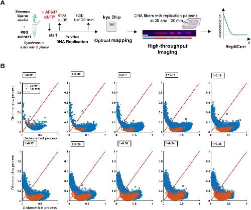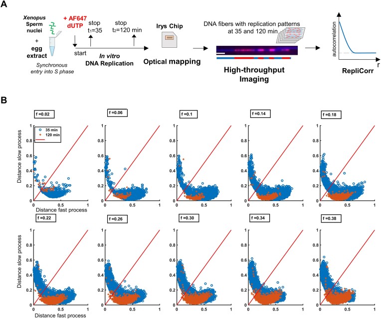 Figure 4. RepliCorr analysis of the HOMARD experiments in the Xenopus in vitro system. (A) Workflow of the experiment using HOMARD: Sperm nuclei were incubated in egg extracts in the presence of AF647-aha-dUTP, stopped in early (35 min) and late S phase (120 min), DNA was isolated and separated in Irys system with Yoyo-1 stain. Example DNA fiber with Bionano Irys system, Yoyo-1, whole DNA stain, small replication tracks (=initiations) labeled directly by AF647-aha-dUTP, early S phase (35 min), size bar 20 kb. (B) Normalized correlation coefficients (ρ1, ρ2) between the fibers’ C(r,f) and C1(r,f) and C2(r,f) were calculated. The similarity distance between the fiber and each process was defined as 1 − ρ1 for the fast process and 1 − ρ2 for the slow process and represented on a two-orthogonal axis plot. The diagonal represents points of equal similarity to the two processes;.