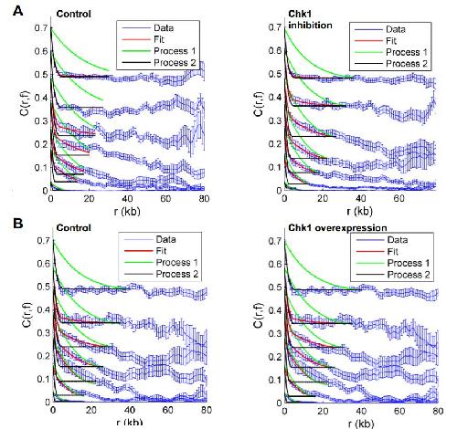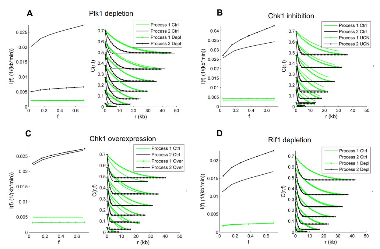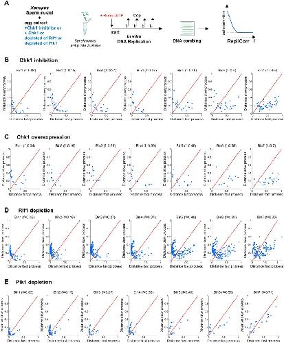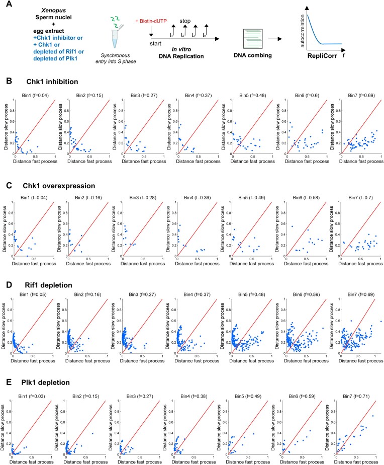 Figure 5. Strong modification of the replication patterns after Plk1 depletion but less after Chk1 inhibition, overexpression or Rif1 depletion. (A) An outline of experimental workflow: sperm nuclei were incubated in Chk1 inhibited or Chk1 overexpressed egg extracts or Rif1 or Plk1 immunodepleted egg extracts in the presence of biotin-dUTP. Genomic DNA was isolated at different times during the S phase, subjected to combing analysis and further analyzed by RepliCorr. Normalized correlation coefficients (ρ1, ρ2) between the fiber’s C(r, f) and C1(r, f) and C2(r, f) were calculated. The similarity distance between the fiber and each process was defined as 1 − ρ1 for the fast process and 1 − ρ2 for the slow process and represented on a two orthogonal axis plot. The diagonal represents points of equal similarity to the two processes. (B) Chk1 inhibition by UCN-01 (independent experiments n = 2). (C) Chk1 overexpression (n = 2). (D) Rif1 depletion (n = 2) and (E) Plk1 depletion (n = 3).
