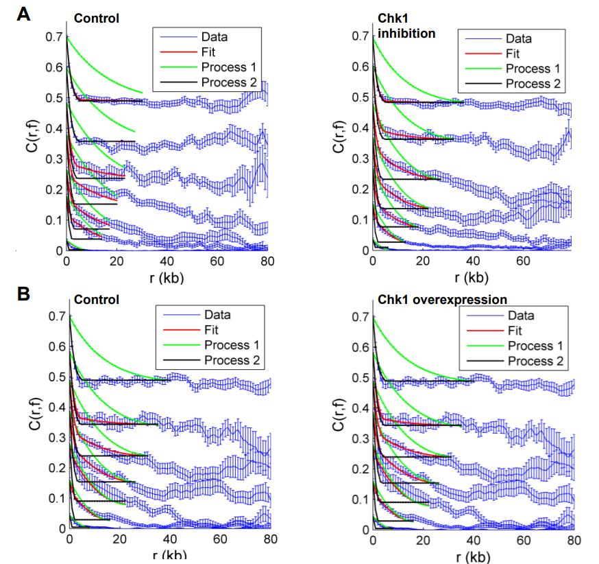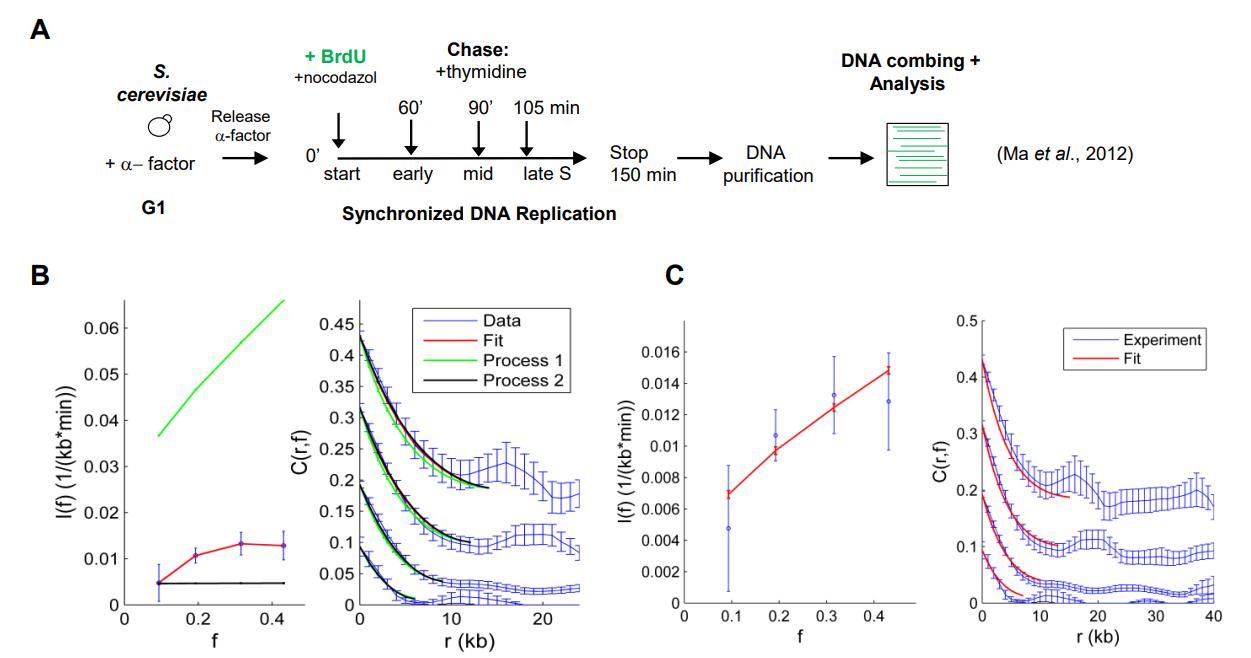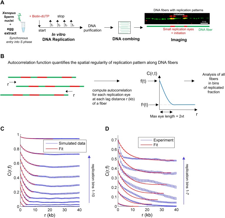 Figure 1. Filtering of replication patterns of single DNA molecules from DNA combing experiments during unperturbed S phase by an auto-correlation function C(r, f). (A) Workflow of DNA combing experiments in the Xenopus in vitro system. Sperm nuclei were incubated in egg extract in the presence of biotin-dUTP; replication reactions were stopped at different times during the unperturbed, naturally synchronous S phase; and DNA was purified and stretched onto coverslips. Replicated tracks on single DNA fibers were revealed by fluorescence microscopy after immunolabeling [replication eyes (red) and DNA molecule (green)]. (B) Auto-correlation function C(r) measures the spatial regularity of replication patterns of a DNA molecule and its shifted copies as a function of the lag distance r. (C) C(r, f) profile for a simulated dataset (mean with error, blue) for constant I(f) (0.03 kb−1 min−1) and constant \documentclass[12pt]{minimal}