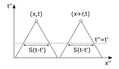 Fig. 4. Representation of the causal cones for two correlated points. The