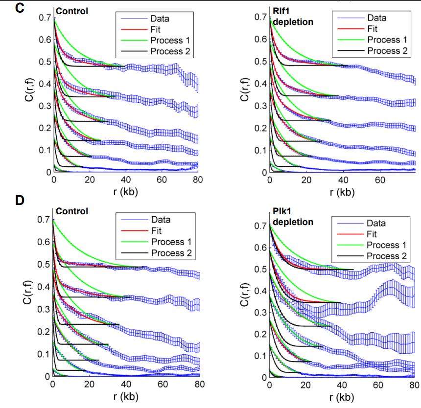 $v$\end{document} (1 kb/min) and fit (red) with one process at different bins of replicated fractions f. (D) Mean simulated C(r, f) profiles with standard deviation for three independent control DNA combing experiment at different bins of replicated fractions f and fit with one process using the KJMA model. Bins of replicated fraction are f1 = (0, 0.11], f2 = (0.11, 0.21], f3 = (0.21, 0.32], f4 = (0.32, 0.42], f5 = (0.42, 0.54], f6 = (0.54, 0.64], and f7 = (0.64, 0.75].