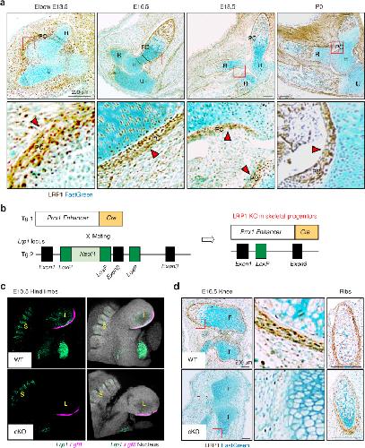 Fig. 1. LRP1 is abundantly expressed in skeletal progenitor cells, in particular in the perichondrium. a Representative images of immunohistochemical staining of LRP1 and fast green counterstaining in WT E13.5-P0 elbow joint sections of Lrp1flox/flox mice. Scale bar, 200 µm. H, humerus; R, radius; U, ulna; PC, perichondrium. Regions delineated by the red squares in the panels have been magnified in the lower panels. Arrow heads indicate abundant LRP1 expression in perichondrium layers. b Schematic diagram showing the constructs used to generate skeletal progenitor-selective LRP1 conditional knockout mice. Transgenic mouse lines harbouring Prrx1 limb enhancer Cre (Tg 1) and floxed Lrp1 (Tg 2) were used to establish the Lrp1flox/flox/Prrx1Cre line. c In situ hybridisation chain reaction for Lrp1 and Fgf8 mRNA expression in E10.5 hind limbs of WT and Lrp1flox/flox/Prrx1Cre homozygote conditional KO (cKO) mice. Lrp1 and Fgf8 were visualised as described under “Materials and Methods”. L, bulging limb bud; S, somite. d Representative images of immunohistochemical staining of LRP1 and fast green counterstaining in E16.5 knee and rib sections of WT and Lrp1flox/flox/Prrx1Cre homozygote conditional KO (cKO) mice. Regions delineated by the red squares in the upper panels have been magnified in the lower panels. Scale bar, 200 µm. F, femur; T, tibia