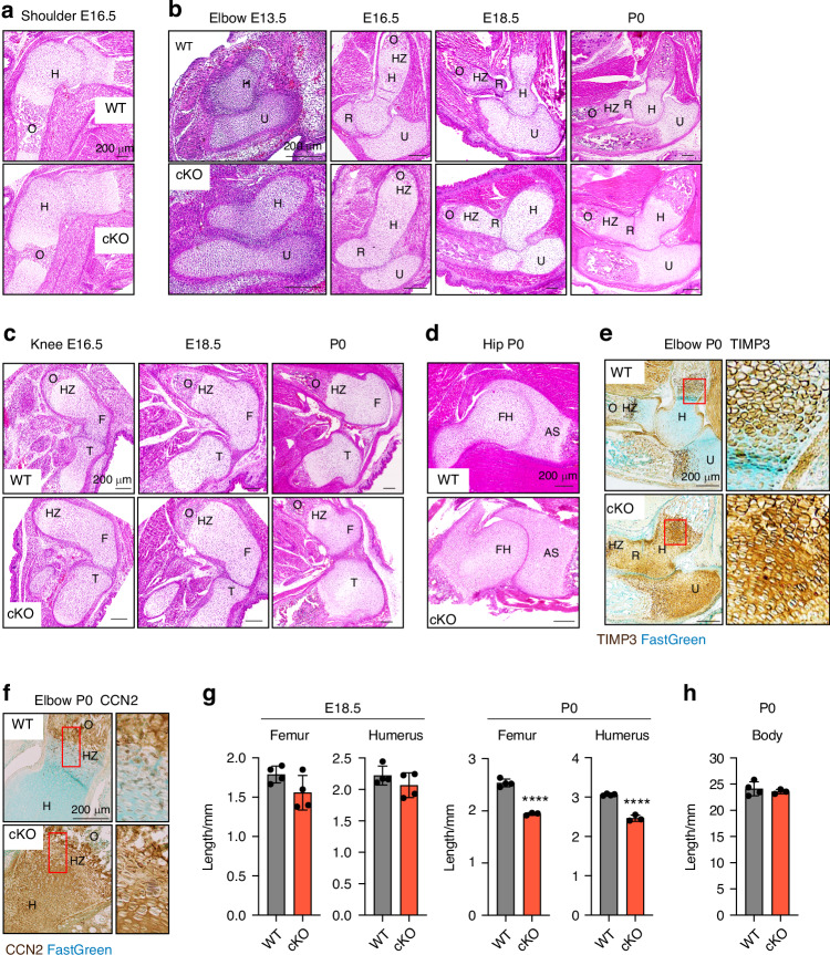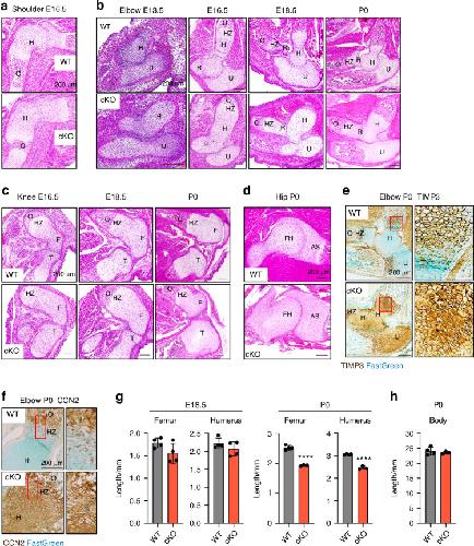 Fig. 2. Conditional deletion of Lrp1 in skeletal progenitors impairs early bone and joint formation. Representative images of H&E staining of E16.5 shoulder (a), E13.5-P0 elbow (b), E16.5-P0 knee (c) and P0 hip (d) sections of WT and Lrp1flox/flox/Prrx1Cre homozygote conditional KO (cKO) mice. Scale bar, 200 µm. H, humerus; R, radius; U, ulna; HZ, hypertrophic zone; O, primary ossification centre; F, femur; FH, femur head; T, tibia; AS, acetabulum socket. e and f, Representative images of immunohistochemical staining of TIMP3 (e) and CCN2 (e) and fast green counterstaining in E16.5 knee sections of WT and cKO mice. Regions delineated by the red squares in the panels have been magnified in the right panels. Scale bar, 200 µm. g and h, Length of femur and humerus mineralised bone (g) and body (h) of E18.5 (g) and P0 (gand h) WT and cKO mice. Circles represent individual mice and bars show the mean ± SD. P values were evaluated by 2-tailed Student’s t test. ****P < 0.000 1