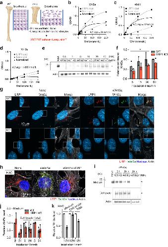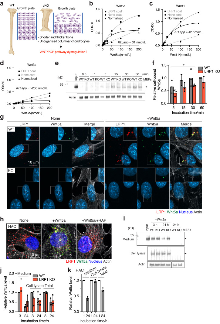 Fig. 6. LRP1 mediates endocytosis of Wnt5a, a core non-canonical WNT/planar cell polarity (PCP) pathway component. a Schematic diagram illustrating the long bone phenotype of Lrp1flox/flox/Prrx1Cre mice. Full-length sLRP1 was coated onto microtiter plates and the binding of 0–200 nmol/L Wnt5a (b), Wnt11 (c), Wnt3a (d) was measured using specific antibody for each Wnt as described under “Materials and Methods”. Mean values of technical duplicates for none-coating, LRP1-coating and after normalisation were shown as circles, squares and triangles, respectively. Extrapolated KD,app values were estimated based on one-phase decay nonlinear fit analysis (black lines). WT and LRP1 KO MEFs (n = 3) were incubated with 40 nmol/L Wnt5a for 0.5–60 min and Wnt5a in the cell lysate was detected by Western blotting (e). The relative amount of Wnt5a was expressed by taking the amount of Wnt5a after 60-min incubation as 1 (f). Circles represent individual mice and bars show the mean ± Svalues for the amount of Wnt5a after incubation for 5–30 min in WT versus LRP1 KO MEFs were evaluated by two-way ANOVA. *P < 0.05. Representative images of confocal microscopy analysis for Wnt5a and LRP1 in WT and LRP1 KO MEFs (n = 3) (e) or human normal chondrocytes (n = 3) f Cells were incubated with 20 nmol/L Wnt5a for 3 h in the absence (g, h) or presence of 500 nmol/L RAP (h). Wnt5a, LRP1, cytoskeleton and nucleus were visualised as described under “Materials and Methods”. Scale bar, 10 µm. Regions delineated by the white squares in the panels have been magnified in the top right (g). WT and LRP1 KO MEFs (n = 3) were incubated with 20 nmol/L Wnt5a for 3–24 h and Wnt5a in the medium and cell lysate were detected by Western blotting (i). Densitometric analysis of immunoreactive Wnt5a bands was carried out. The relative amount of Wnt5a in the media, cell lysate and both media and cell lysate (total) were expressed by taking the amount of Wn5a after 3-h incubation in WT MEFs as 1 (j). k human normal chondrocytes (n = 3) were incubated with 20 nmol/L Wnt5a for 1–24 h and analysed as in a and b. The relative amount of Wnt5a after 24-h incubation was expressed by taking the amount of Wn5a after 1-h incubation as 1. Circles represent individual experiment and bars show the mean ± SD