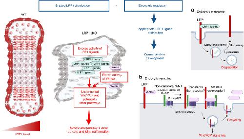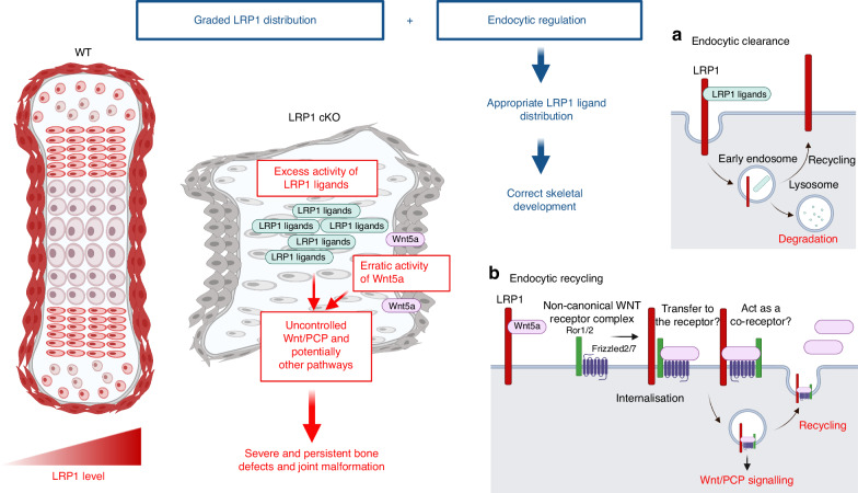 Fig. 9. A novel and critical role for LRP1 in skeletal development and its deficiency in emergence of skeletal pathologies. Skeletal progenitor LRP1 is likely to have at least two different functions: to remove molecules from extracellular milieu and degrad them intracellularly (a), and to capture, recycle and distribute molecules (b). Combination of graded distribution of LRP1 and LRP1-mediated endocytosis regulates distribution of extracellular signalling molecules. This provides a novel mechanism for appropriate distribution of extracellular signalling molecules to ensure that bone and joint form correctly. Thus, loss of LRP1 leads to excess activity of some of LRP1 ligands and erratic Wnt/PCP signalling, resulting in severe defects in multiple bones and joints. Illustration created with BioRender (https://biorender.com)