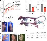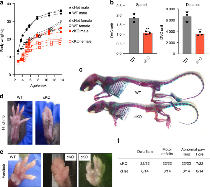 Fig. 3. LRP1 deficiency in skeletal progenitors results in dwarfism, impaired mobility and fore/hind limb malformation. a Mouse weight measurement from 3-14 weeks after birth. Closed (male) and open (female) black circles (WT), black triangles (cHet; Lrp1flox/wt/Prrx1Cre heterozygote conditional KO), and red squares (cKO; Lrp1flox/flox/Prrx1Cre homozygote conditional KO) represent individual mice. b Total distance and average speed of WT and cKO mice. Locomotor activity of 6-week-old mice measured by the continuous automated home-cage monitoring system for 4 weeks. Circles represent individual mice and bars show the mean ± SD. **P < 0.01 by 2-tailed Student’s t test. c Whole-mount skeletal staining of 14-week-old mice with Alcian blue and Alizarin red. d Photographs of 8-week-old WT and the cKO hind paws. e Photographs of 8-14-week-old WT and the cKO fore paws. f Table showing the frequencies of the identified phenotypes