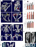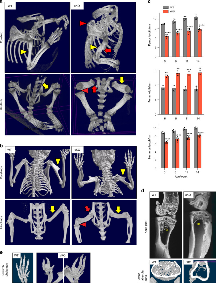 Fig. 4. Severe and persistent defects in multiple bones and joint in Lrp1flox/flox/Prrx1Cre mice. Representative images of in vivo X-ray analysis of limbs of 2-week-old (a) and 14-week-old (b) WT and Lrp1flox/flox/Prrx1Cre homozygote conditional KO (cKO) mice. Yellow arrowheads and arrows indicate humerus and femur quantified in c. Red arrowheads and arrows indicate undefined shoulder blades and twisted long bones (top panels), and undefined knee and lack of hip joints (bottom panels) in cKO mice, respectively. c Femur and humerus bone length and femur width of 6-14-week-old mice. Circles represent individual mice and bars show the mean ± SD. **P < 0.01; ***P < 0.001; ****P < 0.000 1 by 2-tailed Student’s t test. d Representative images of high-resolution μCT analysis of femur trabecular bones of 14-week-old mice. TB, trabecular bone. e Representative images of in vivo X-ray analysis of forelimb phalanges of 14-week-old cKO mice