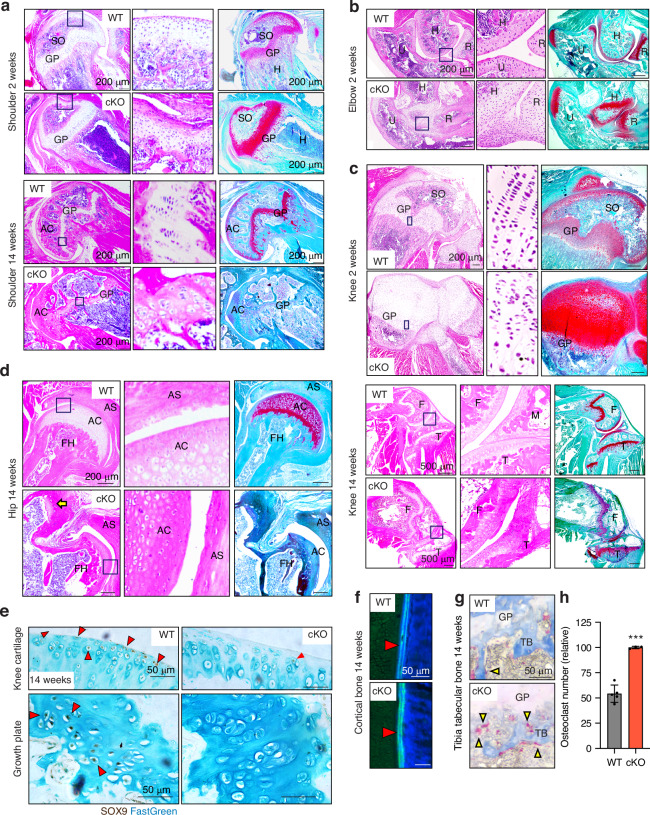(cKO) mice. Arrow indicates the extra groove of femoral heads (d). Regions delineated by the dark blue squares in the panels have been magnified in the right panels. Scale bar, 200 µm. GP, growth plate; AC, articular cartilage; F, femur; T, tibia; M, menisci. e, Representative images of immunohistochemical staining of SOX9 in knee articular cartilage and growth plate sections of 14-week-old WT and cKO mice. Arrow heads indicate cells with SOX9 positive staining. Scale bar, 50 µm. f Representative images of fluorescent microscopy analysis of calcein-double stained cortical bones in 14-week-old mice (n = 3 each). Red arrowheads indicate calcein double staining in cortical bone. Scale bar, 50 µm. g TRAP and aniline blue staining of tibia trabecular bone of 14-week-old mice. Yellow arrowheads highlight osteoclast staining. Scale bar, 50 µm. TB, trabecular bone; GP, growth plate. h Measurement of osteoclast numbers in WT and Lrp1flox/flox/Prrx1Cre (cKO) trabecular bones. Circles represent individual mice and bars show the mean ± SD. ***P < 0.001 by 2-tailed Student’s t test