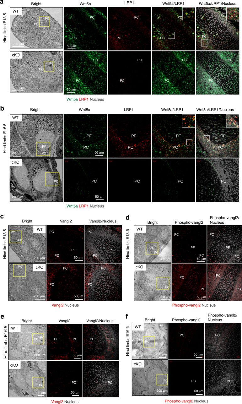 Fig. 7. LRP1 partially colocalises with Wnt5a and its deficiency alters abundance and distribution of Wnt5a in the developing limbs. Representative images of confocal microscopy analysis for Wnt5a and LRP1 (a and b), and total (c and e) and phosphorylated Vangl2 (d and f) in E13.5 (a, c and d) or E16.5 (b, e and f) hind limb sections of WT and Lrp1flox/flox/Prrx1Cre (cKO) mice (n = 3). Wnt5a, LRP1, Vangl2, phospho-Vangl2 and nucleus were visualised as described under “Materials and Methods”. Regions delineated by the white squares have been magnified in the top right of each panel. PF proliferative flattened chondrocytes; PC perichondrium. Scale bar, 50 µm