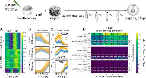 Fig. 3. Depletion of Nup107 alters temporal differential expression of specific genes. (A,B) Summary of gene clusters with increased expression by heatmap (A) and cluster average (B). Clustered data is maximum normalized Gaussian process median expression for each gene. B provides mean±s.d. for each cluster. Decreased genes and ribozero clusters given in Fig. S7A,B. (C) Gene expression examples for each increased expression cluster for UIC and MO. Data points are gene expression in TPM; central line and shaded region are transformed Gaussian process median and 95% CI, respectively. (D) Enrichment of exact instances of microRNA seeds within 3′ UTRs of genes of each cluster. Color gives Fisher’s exact test −log10 P-value between the given number of instances and a gene being present in a cluster. Seeds organized by number of mismatches to miR427 sequences; see Materials and Methods for details. Schematic at top shows illustrates the experimental workflow. MO, nup107 MO; UIC, uninjected control.