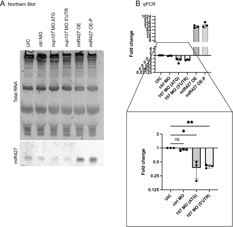 Fig. 4. miR427 expression levels at stage 8. (A) Northern blot showing relative levels of miR427 in comparison to total RNA amounts; miR427 OE and miR427 OE-P are positive overexpression controls. (B) qPCR quantification of miR427 expression levels using LNA probes for miR427 and u6 (small RNA standardization control). Three biological replicates were used for all experiments. All data represent results from experiments replicated at least three times in the laboratory. Statistical significance was determined using two-way ANOVA analysis. *P<0.05, **P<0.01. ns, not significant. Data are mean±s.d.