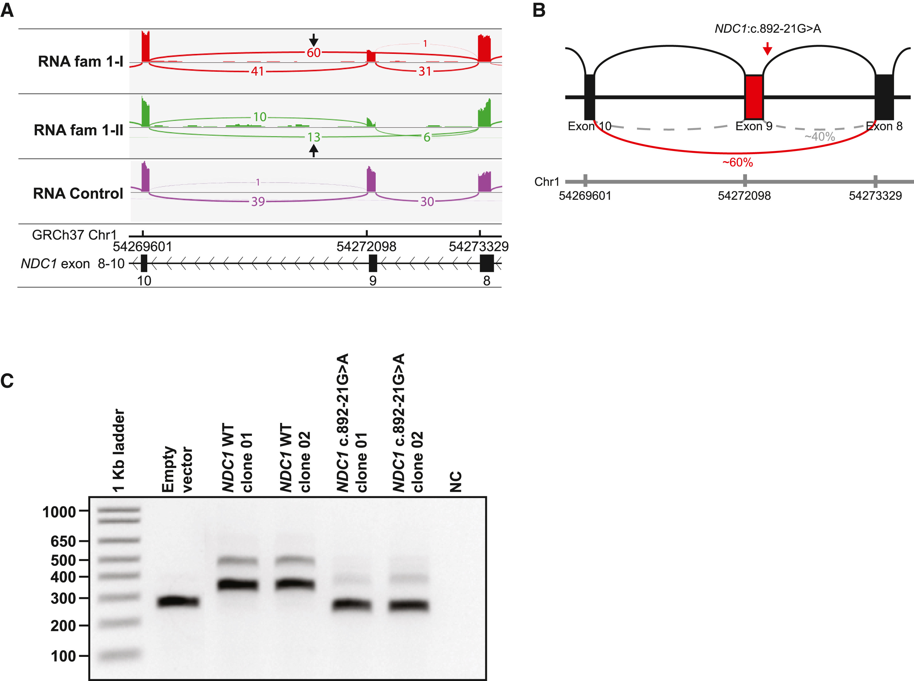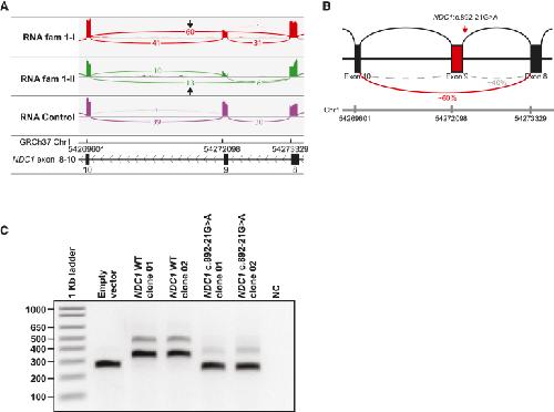(B) Schematic representation of the effect of the homozygous NDC1:c.892-21G>A variant on splicing. In approximately 60% of the reads skipping of exon 9 is observed.