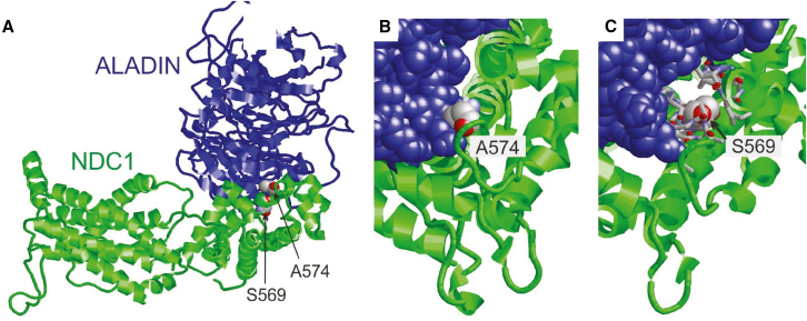 (A) View of the ALADIN-NDC1 heterodimers of the Xenopus laevis NPC. NDC1-ALADIN heterodimer showing that p.Ser569 and p.Ala574 are located close to the dimer interface. This panel is adapted from Huang et al.28