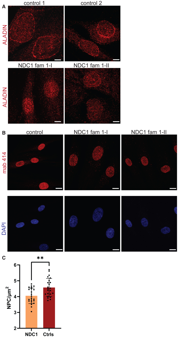 Figure 4. NDC1 variants interfere with ALADIN recruitment and NPC insertion(A) Cell lines were stained with anti-ALADIN antibodies (red) and its localization was evaluated with confocal microscopy. n = 2 independent experiments, >10 fields per cell line were evaluated, n = 2 NDC1 individuals; family 1-I and family 1-II.(B) The number of NPCs was examined upon staining with the Mab-414 antibody (red). Nuclei were counterstained with DAPI. The structure of the NE and NPC localization were evaluated with confocal microscopy.(C) Quantification of the number of NPCs in post mitotic cells (CDT1+) with 3D SIM microscopy after staining with the Mab-414 antibody (red). n = 3 experiments, n = 2 NDC1 individuals, n = 2 controls, two tailed unpaired t test, error bars represent the standard error of the mean (SEM)). ∗∗p < 0.01.