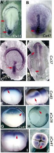 Figure 6. Expression of connexin genes in frog and chick embryos. A: Cx31 is expressed in the posterior margin of the area pellucida in the chick embryo at stage (st.) 4+ (arrows). B: Cx47 is expressed within the posterior third of the primitive streak at st. 4 (arrow). Cx37 is expressed in the early primitive streak (arrow, C), and in a punctate pattern identifying a subset of the cells of the primitive ridges and neural plate at st. 7 (arrows, D). In Xenopus, maternal Cx40 mRNA is in the anterior pole of the two-cell embryo (arrow, E) and then in a band perpendicular to the animalegetal axis in the four-cell embryo (arrow, F). G: During blastula stages, it is expressed in the cells of the animal cap (arrowhead). H: Radioactive in situ hybridization on sections shows that Cx38 is present in the animal cap and in gastrulating cells (arrow, radioactive section). Cx41 mRNA is spread throughout the animal pole of the two-cell embryo (arrow, I) but is only detected in the nucleus by the four-cell stage (arrow, J). Red arrows indicate domain of expression.