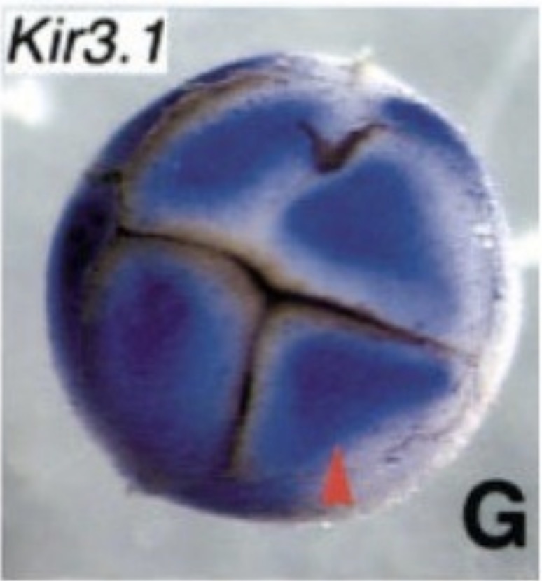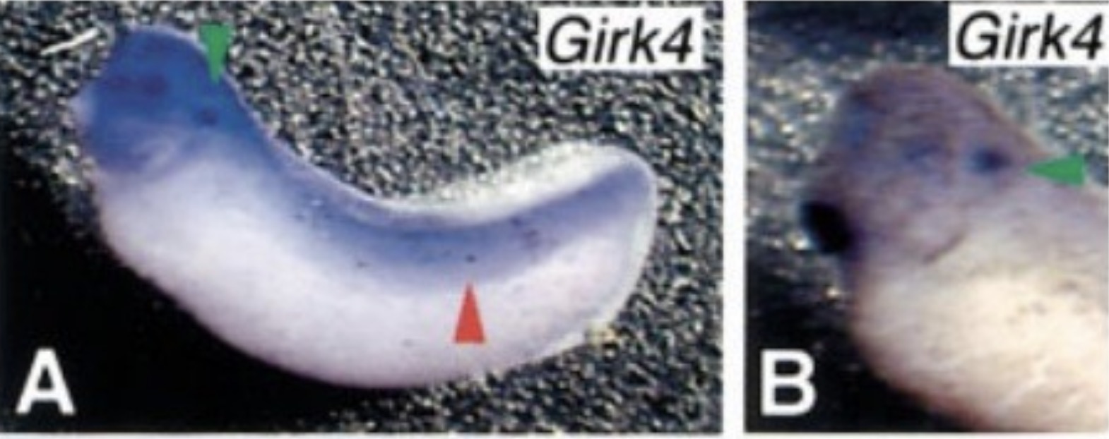Figure 3. Ion channel genes expressed in Xenopus. The inward rectifier Girk4 (kir3.4) K+ channel is expressed in neural tissue in hatched Xenopus embryos (red arrowhead) and is specifically detected in a spot (green arrowheads) on the side of the posterior head (A, close-up in B). C,D: The inward rectifier Kir6.1 is detected as a maternal message in the animal half of vegetal cells during cleavage (arrowheads). E: It is expressed in the neural tissues at somite stages but is also detected in the posterior gut (arrowheads). Maternal mRNA for the inward rectifier channel Girk1 (Kir3.1) is localized in the middle of animal cells during cleavage (arrowheads, F,G), and around the blastopore lip during gastrulation (arrowhead, H). I: Magainin mRNA is detected in the cells of the animal cap of the blastula-stage embryo (arrowheads). The K+ channel Kv1.1 can be detected by radioactive in situ hybridization in animal cells at st. 5 (arrowhead, J) and in cells undergoing ingression at the blastopore at st. 10 (K). A are chromogenic in situ hybridization, whereas J and K are radioactive sections (signal is lighter-colored, background is darker).