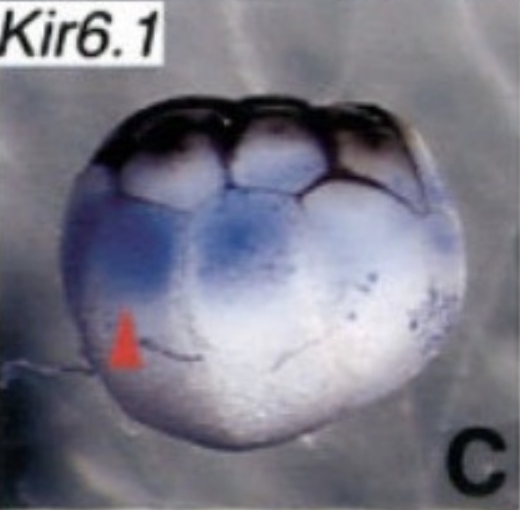 kcnj8 (potassium inwardly rectifying channel subfamily J member 8) gene expression in Xenopus laevis embryo, assayed via in situ hybridization, NF stage 5 (16 cell), lateral view, anterior left, dorsal up.