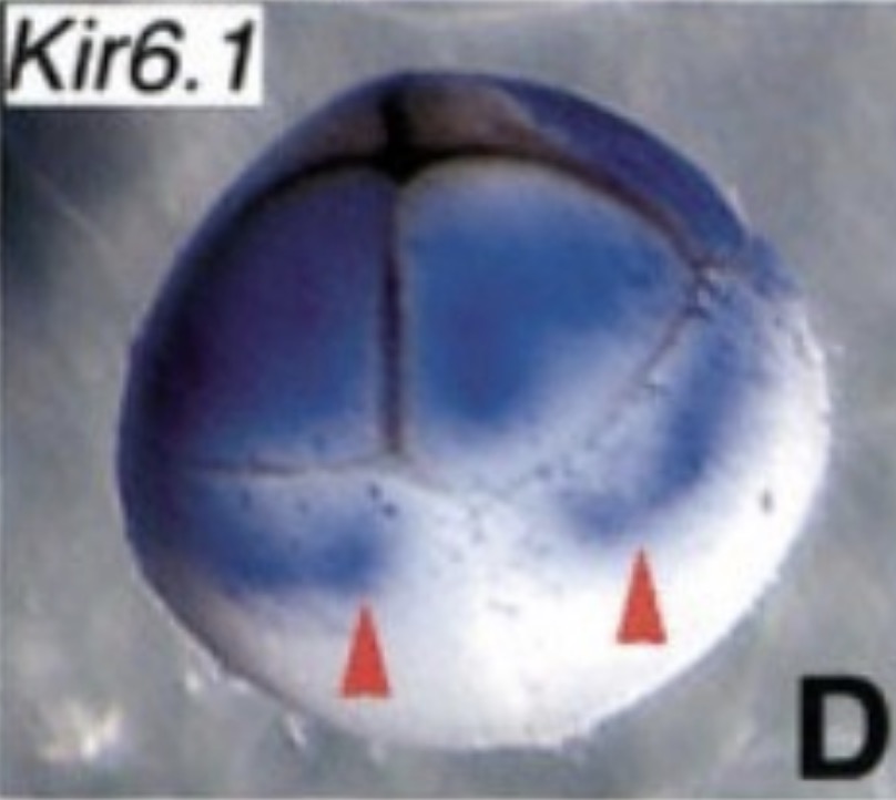 kcnj8 (potassium inwardly rectifying channel subfamily J member 8 ) gene expression in Xenopus laevis embryo, assayed via in situ hybridization, NF stage 4 (8cell), dorsolateral view.