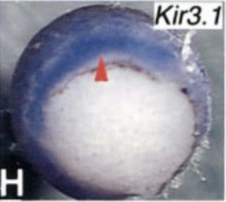 kcnj3 (potassium inwardly rectifying channel subfamily J member 3) gene expression in Xenopus laevis embryo, assayed via in situ hybridization, NF stage 10, vegetal/blastoporal view.