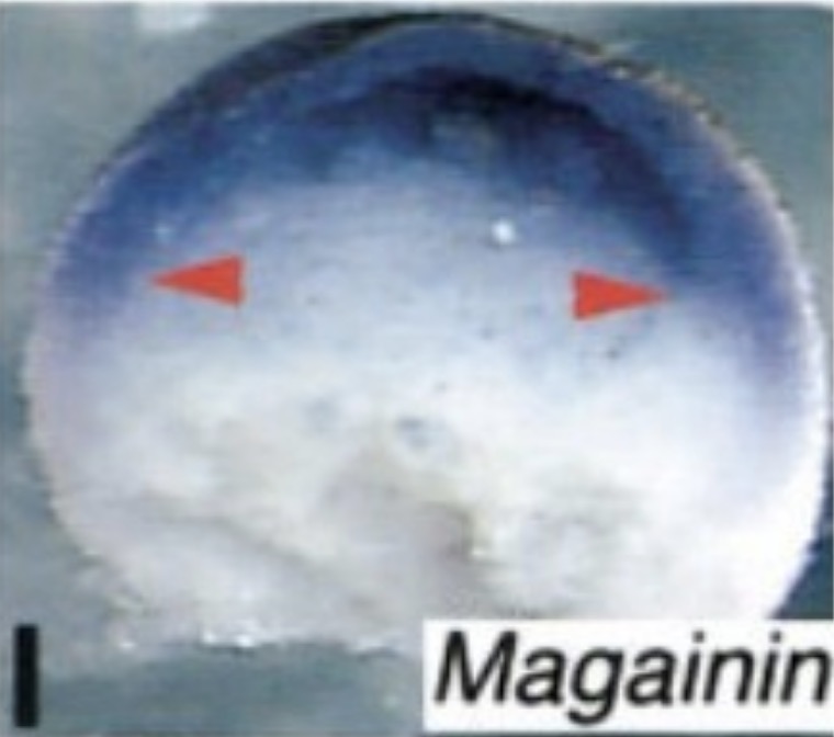 magainins (magainins) gene expression in bisected Xenopus laevis blastula embryo, NF stage 8, assayed via in situ hybridization, lateral view, anterior left, dorsal up.